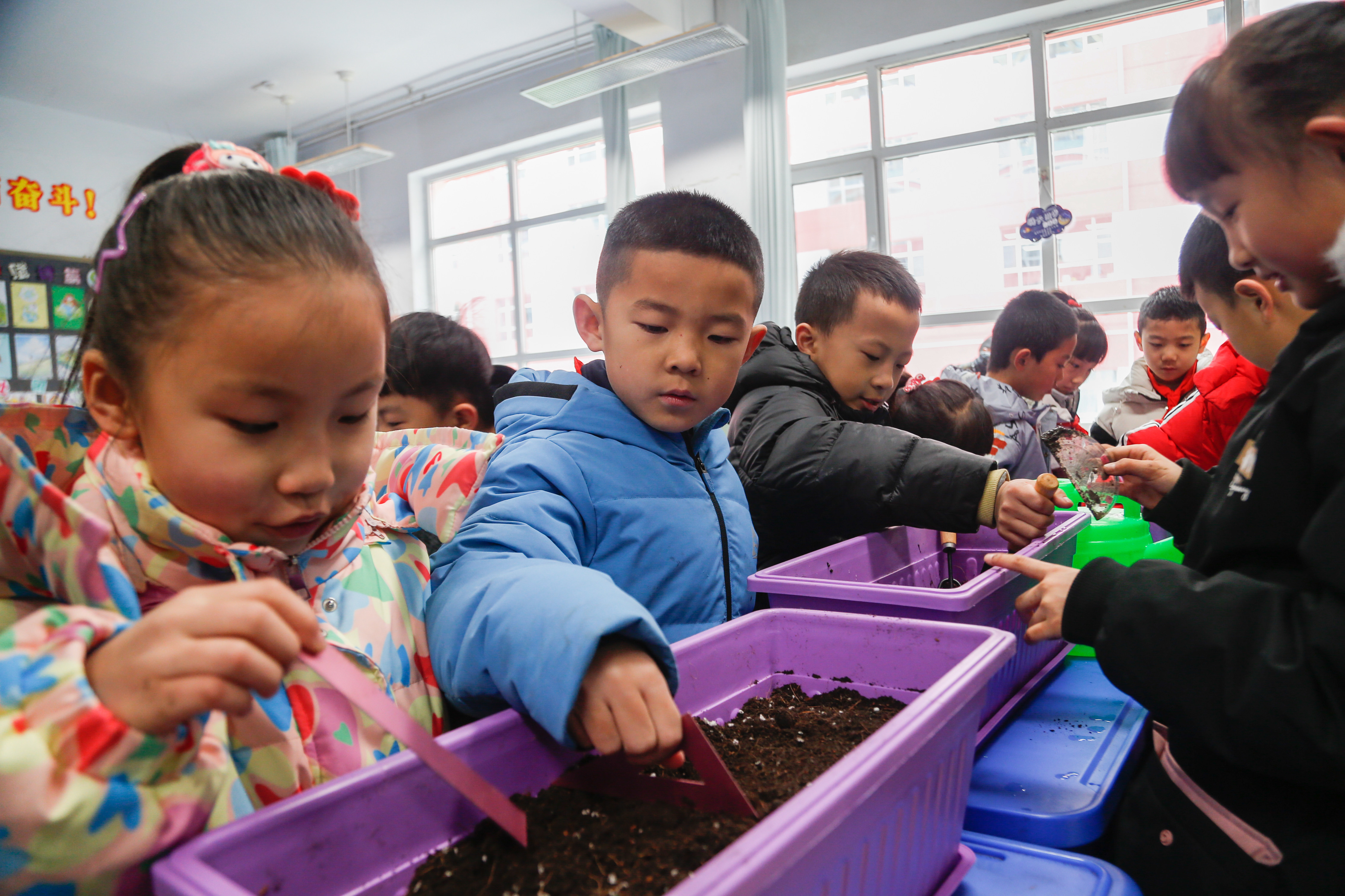 2月23日,西宁市桃李小学的孩子们在栽种开学典礼收到的植物种子。(新华社记者 张子琪 摄)据了解,西宁市公安等部门全力做好新学期交通安全保障工作,全市293所学校公安“护学岗”准时上线,缓解高峰期拥堵问题,为学生安全上学“保驾护航”。(记者张子琪)